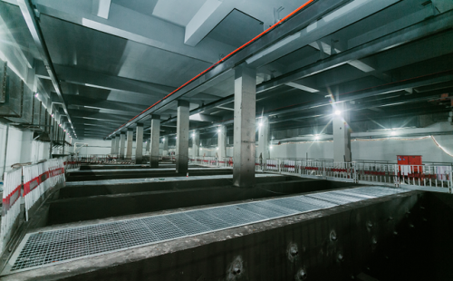 西安市第三污水處理廠并不只是簡(jiǎn)單將地上的污水處理廠“下沉”,而是在充分考慮各類(lèi)安全風(fēng)險(xiǎn)等因素后,重新統(tǒng)籌功能分區(qū),實(shí)現(xiàn)資源整合的最優(yōu)配置。項(xiàng)目采用分層布置形式,地下一層為操作層,為設(shè)備調(diào)控中心和人力檢修中心,地下二層為水處理構(gòu)筑物和綜合管廊,污水處理廠的曝氣池、沉淀池等在這里“一應(yīng)俱全”。同時(shí),項(xiàng)目團(tuán)隊(duì)結(jié)合施工方案對(duì)地下空間進(jìn)行多維度優(yōu)化,形成立體三維布置,通過(guò)優(yōu)化工藝流程、重組單元組團(tuán)、修改構(gòu)筑物布局等方式,提升空間利用效率,將項(xiàng)目占地用地減少了三分之二。