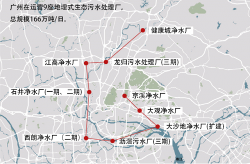 從2010年建成全國首座地埋式膜處理工藝凈水廠——京溪地下凈水廠、2018年初建成全市第二座采用地埋式構(gòu)造的污水處理廠——石井凈水廠(一期)到如今,廣州中心城區(qū)累計建成地埋式污水處理廠9座,呈北斗狀分布于珠江兩岸,被譽為“地下北斗9星”。9座地埋式污水處理總產(chǎn)能181萬噸/日,占廣州中心城區(qū)污水處理總產(chǎn)能的三分之一,占全國同類污水處理模式總產(chǎn)能規(guī)模的五成以上。